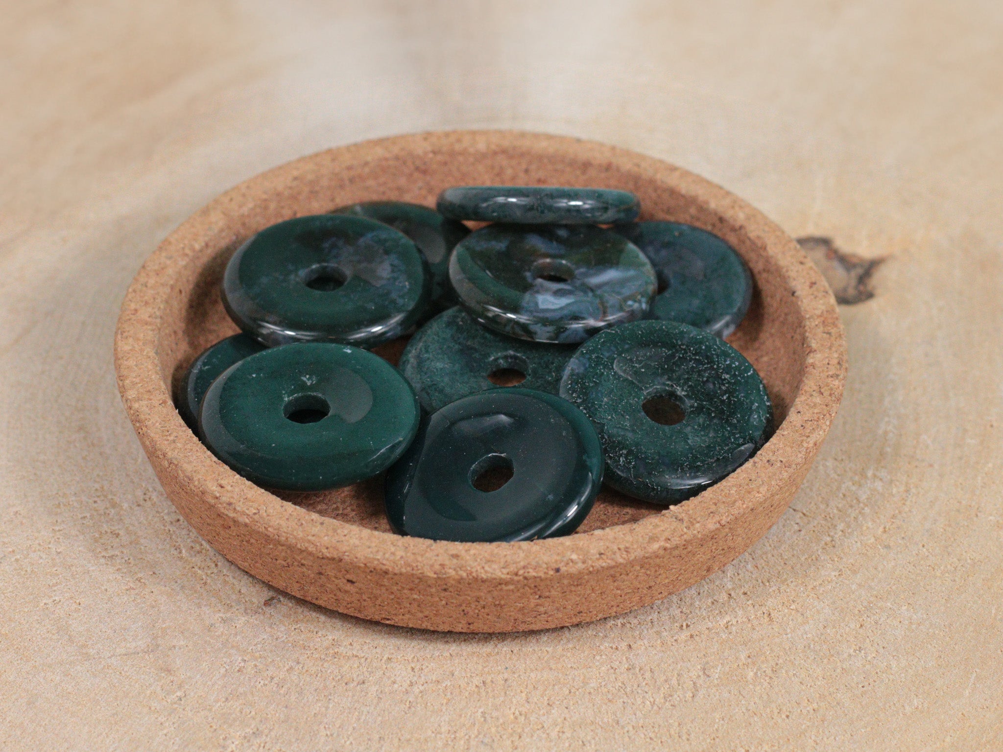 Découvrez le donut en Agate Mousse, une pierre naturelle aux nuances de vert profond qui évoquent la beauté de la végétation. Variété d’agate dendritique proche de la Merlinite elle est réputée en lithothérapie pour ses vertus d’apaisement, de calme intérieur et de connexion à la nature.