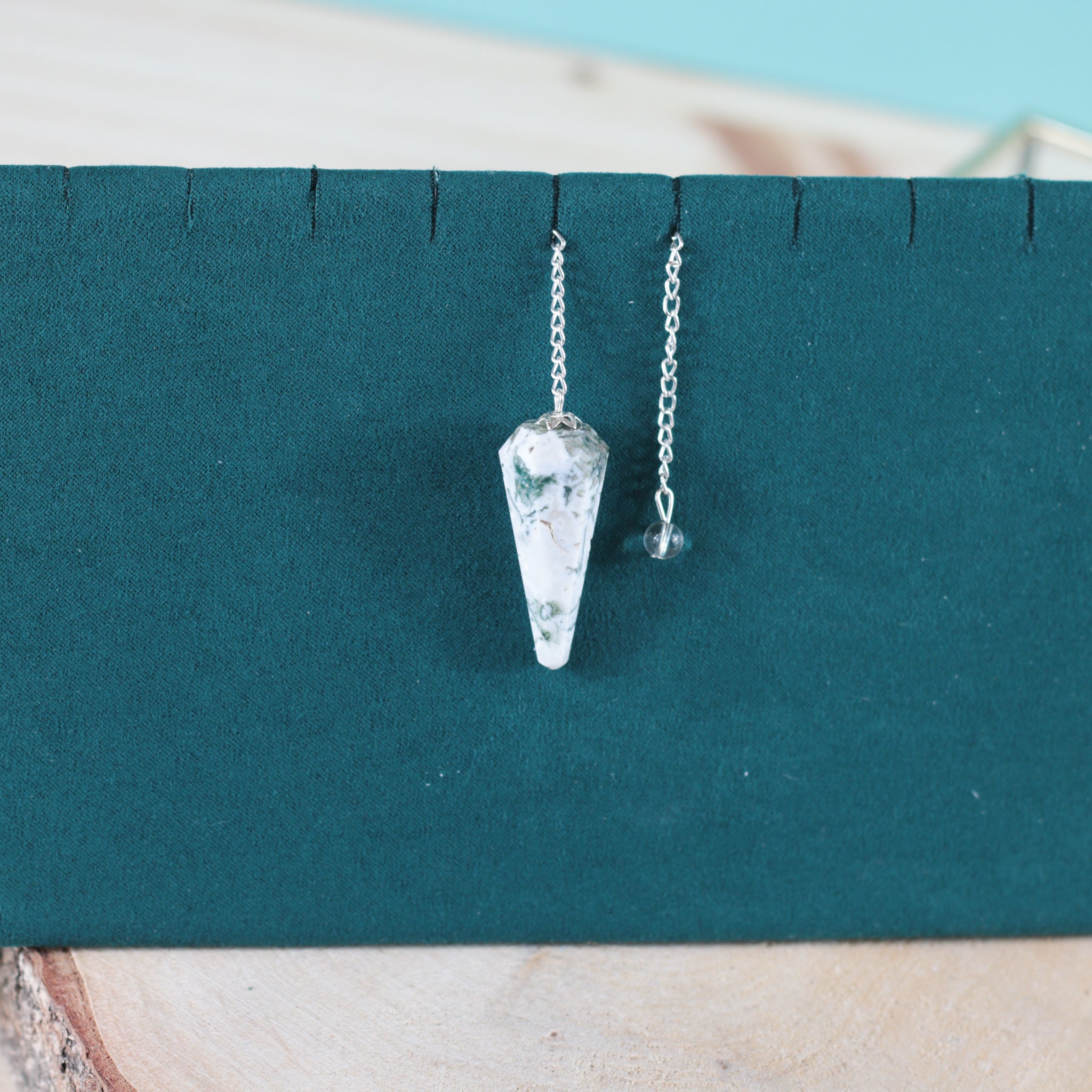 Découvrez le pendule en Agate Arbre, une pierre naturelle aux nuances vertes et blanches rappelant les branches d’un arbre. Ce cristal, variété d’agate dendritique proche de la Merlinite, est reconnu en lithothérapie pour ses vertus de détente, de paix intérieure et de connexion à la nature.