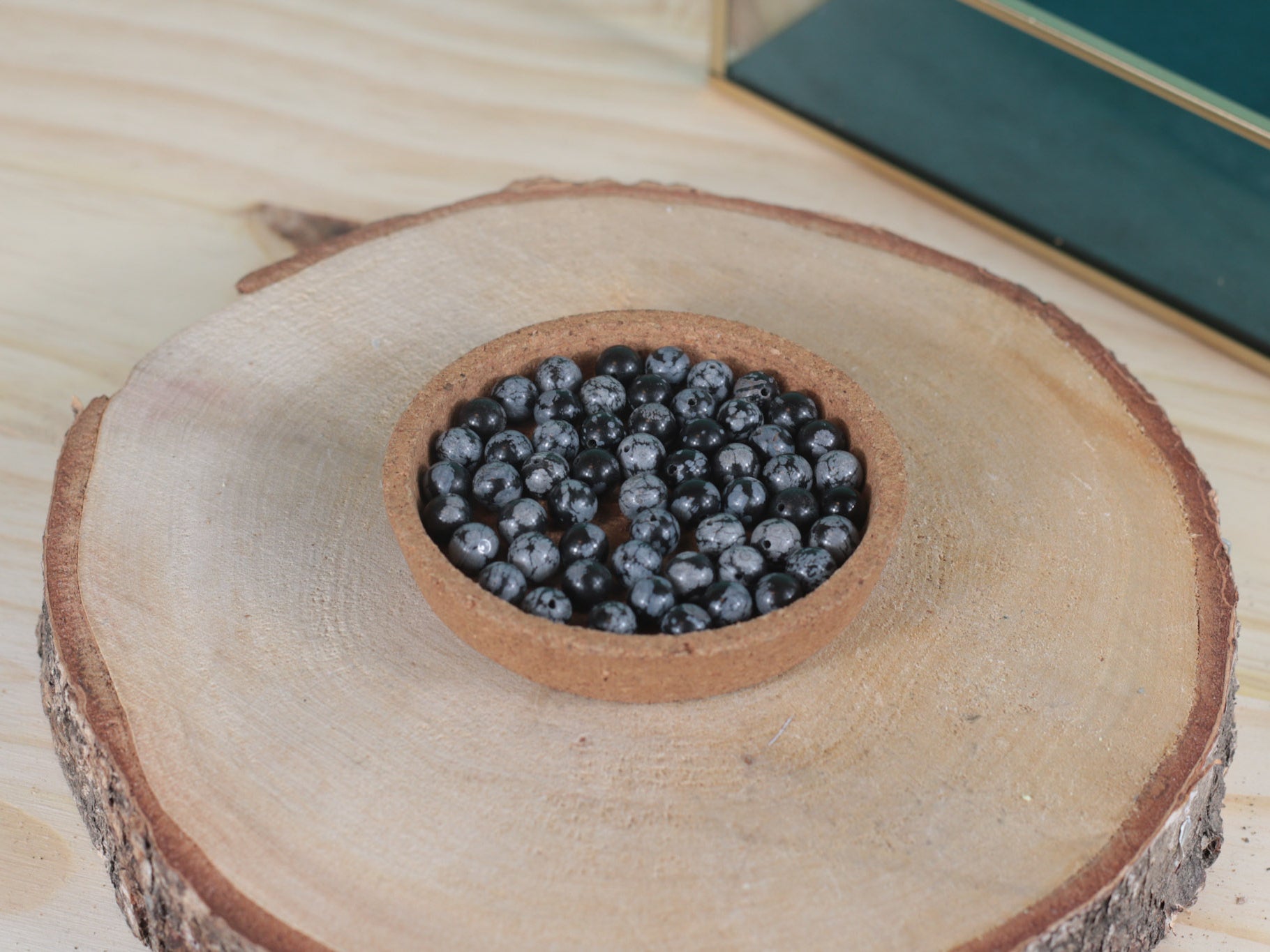 Découvre les perles en Obsidienne Neige, aussi appelée obsidienne floconneuse ou étoilée. Cette pierre naturelle, douce et protectrice, est idéale pour celles et ceux qui souhaitent travailler leur ancrage, renforcer leur stabilité et retrouver le sens des réalités. Moins intense que les autres variétés d’obsidienne, elle est parfaite pour débuter un travail intérieur tout en douceur.