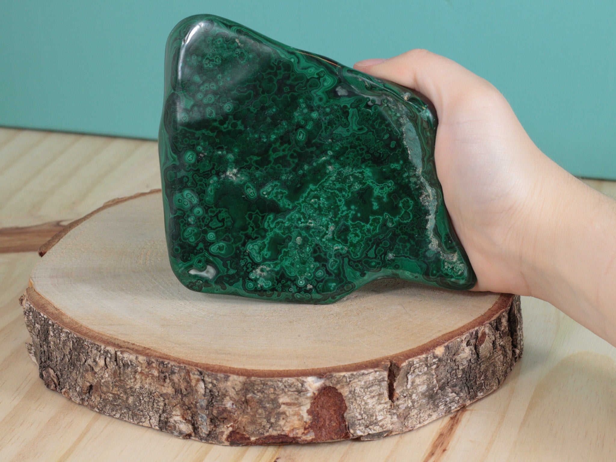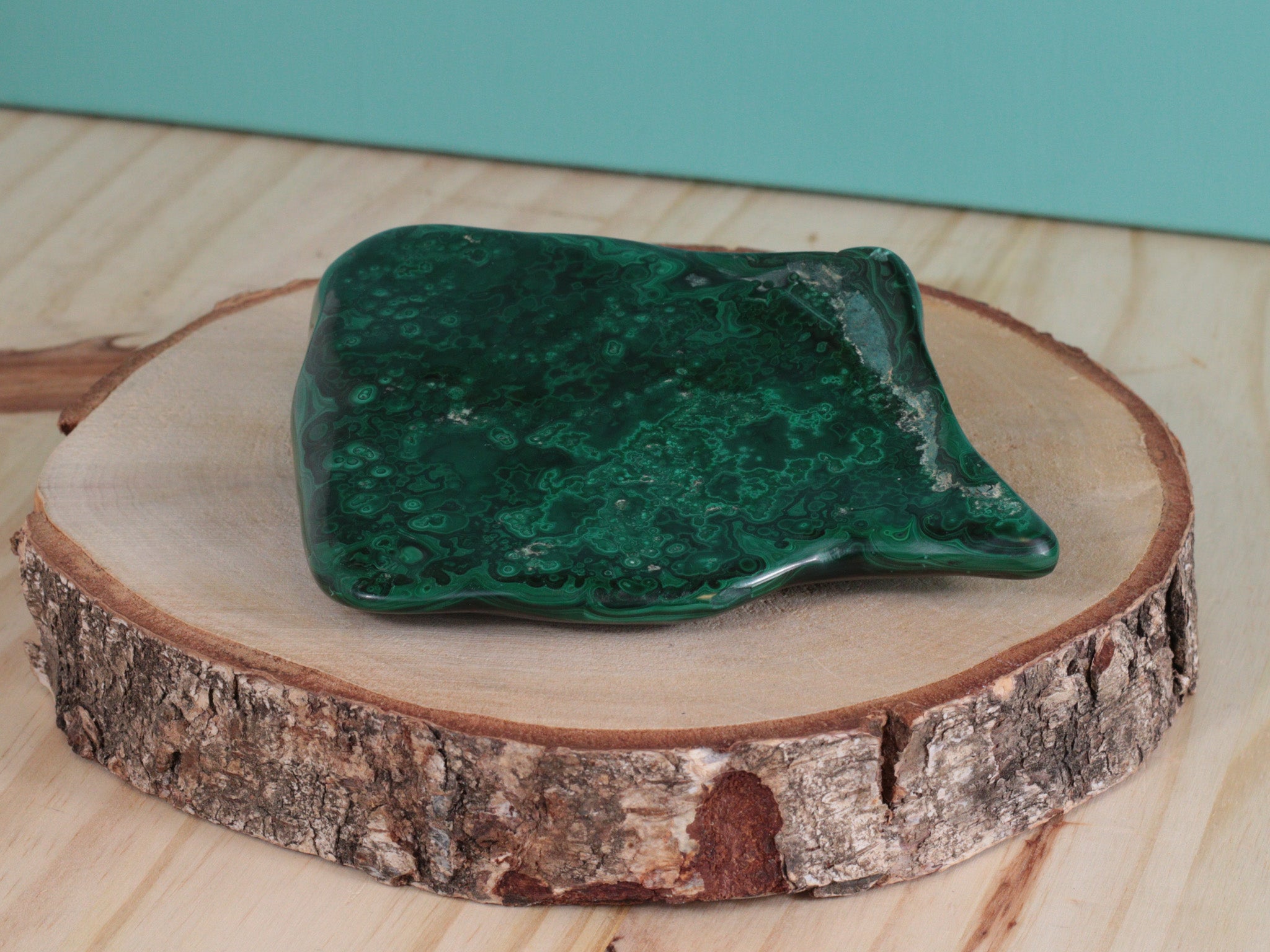 Découvrez la pièce unique en Malachite, une pierre naturelle aux reflets verts intenses, symbole de transformation émotionnelle, de communication sincère et de guérison intérieure.