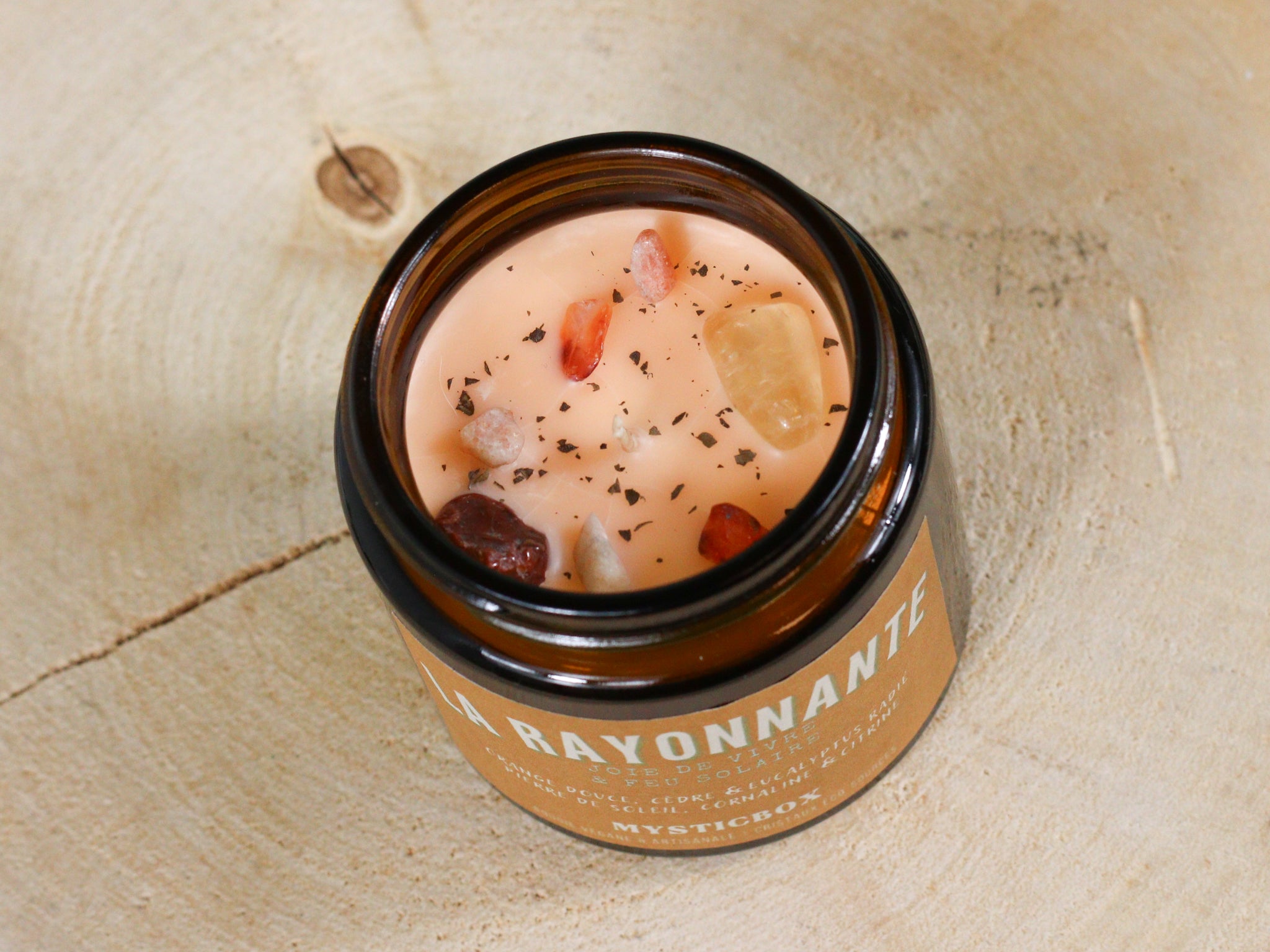 Elle est ornée de pierre de soleil, cornaline et citrine, trois pierres associées à la joie, à l’énergie et au rayonnement, et saupoudrée de verveine citronnée pour renforcer sa vibration lumineuse.